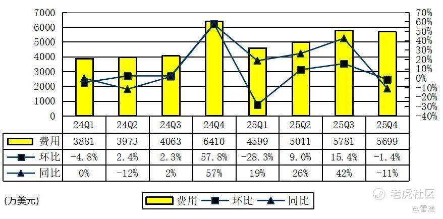迅雷2025年第四季度费用为5699万美元,较上年同期的6410万美元下降11%。