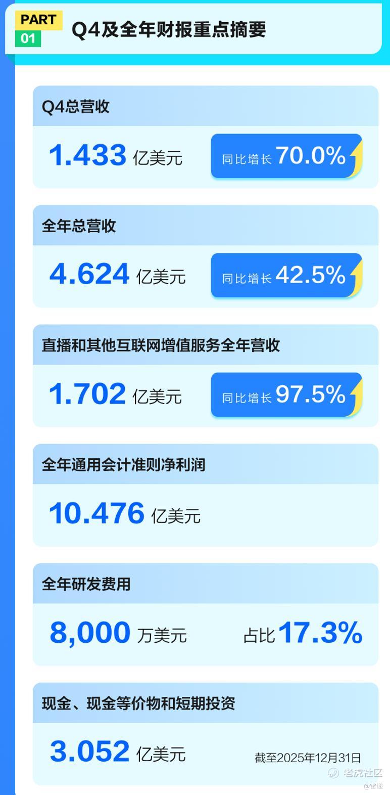 迅雷2025年第四季度营收为1.43亿美元,较上年同期的8430万美元增长22.4%。直播及其他互联网增值服务营收已成为了迅雷第二增长曲线。