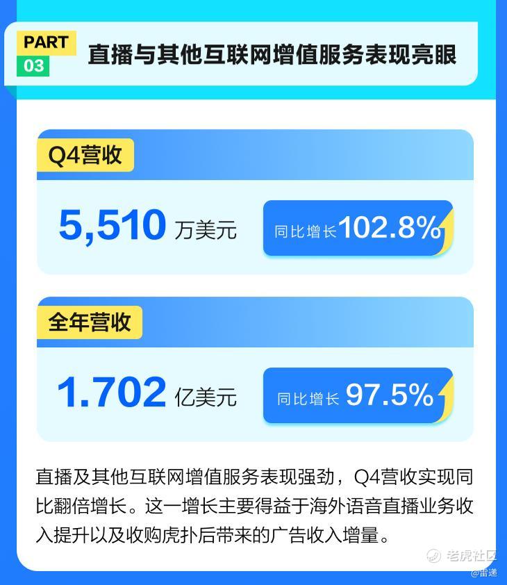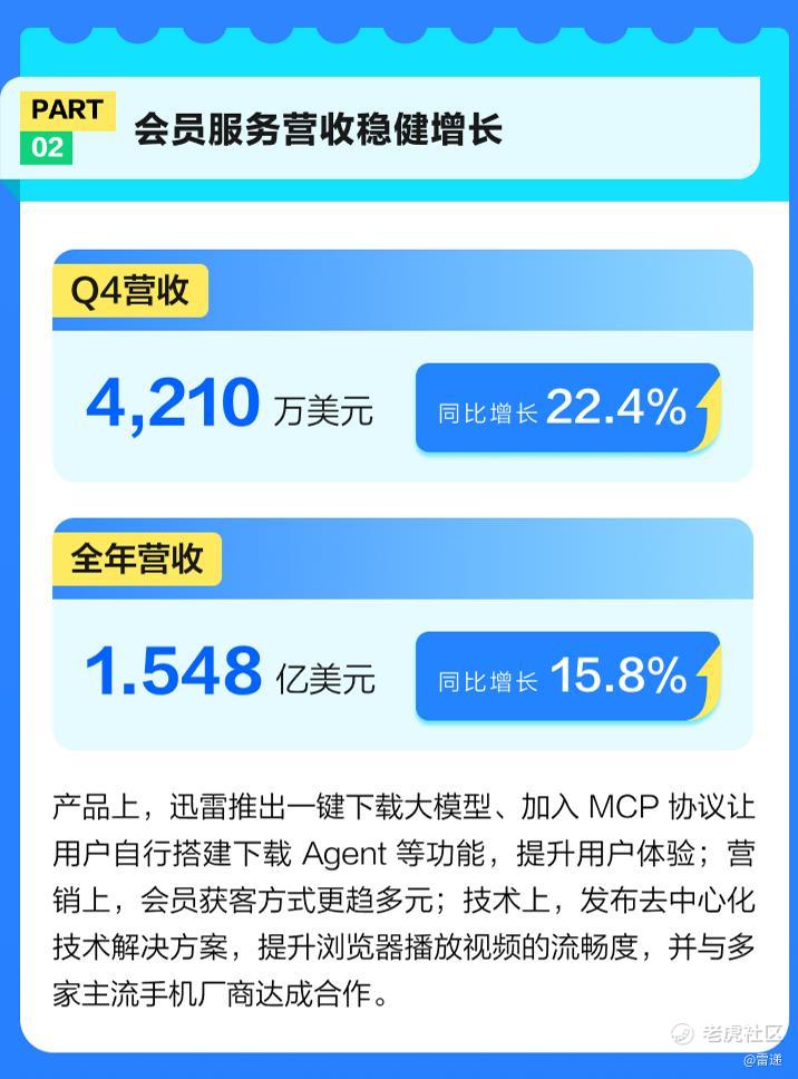 其中,迅雷2025年第四季度订阅收入为4210万美元,较上年同期增长22.4%;直播和其他互联网增值服务收入为5510万美元,较上年同期增长102.8%,这一增长主要是由于海外音频直播业务以及广告业务的增长,这主要是由于收购了虎扑。