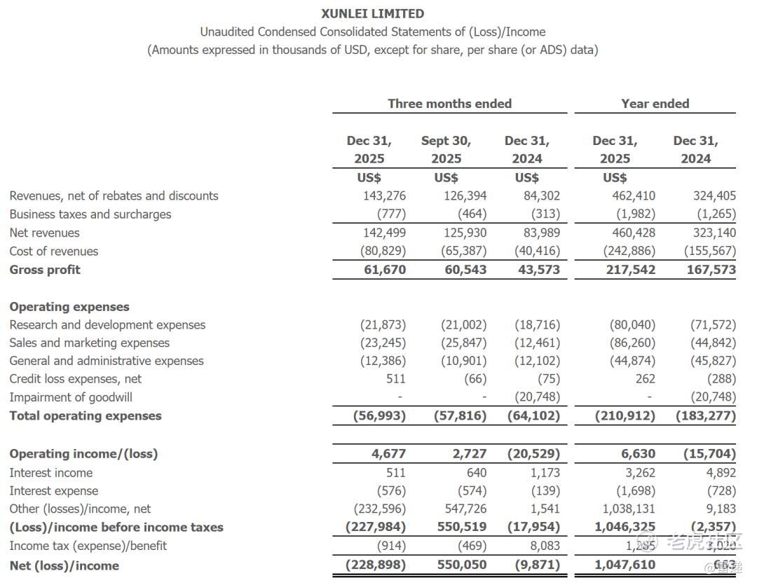 迅雷2025年第四季度净亏损为2.29亿美元,上年同期的净亏损为987万美元,主要是投资的影石创新股价出现了大幅回落。