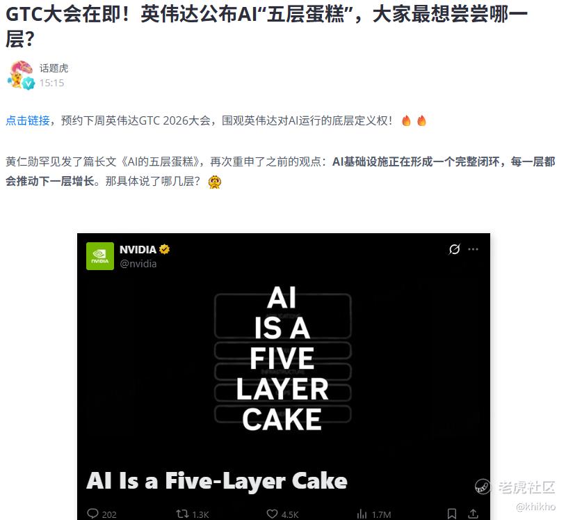 话题虎老师的新话题,也是当下最热门的话题,大家都去围观了吗?[龇牙] 2026年3月10日,英伟达创始人兼CEO黄仁勋在英伟达官网发表了题为AI is a five layer cake的署名长文,这是他自2016年以来的第七篇公开长文。