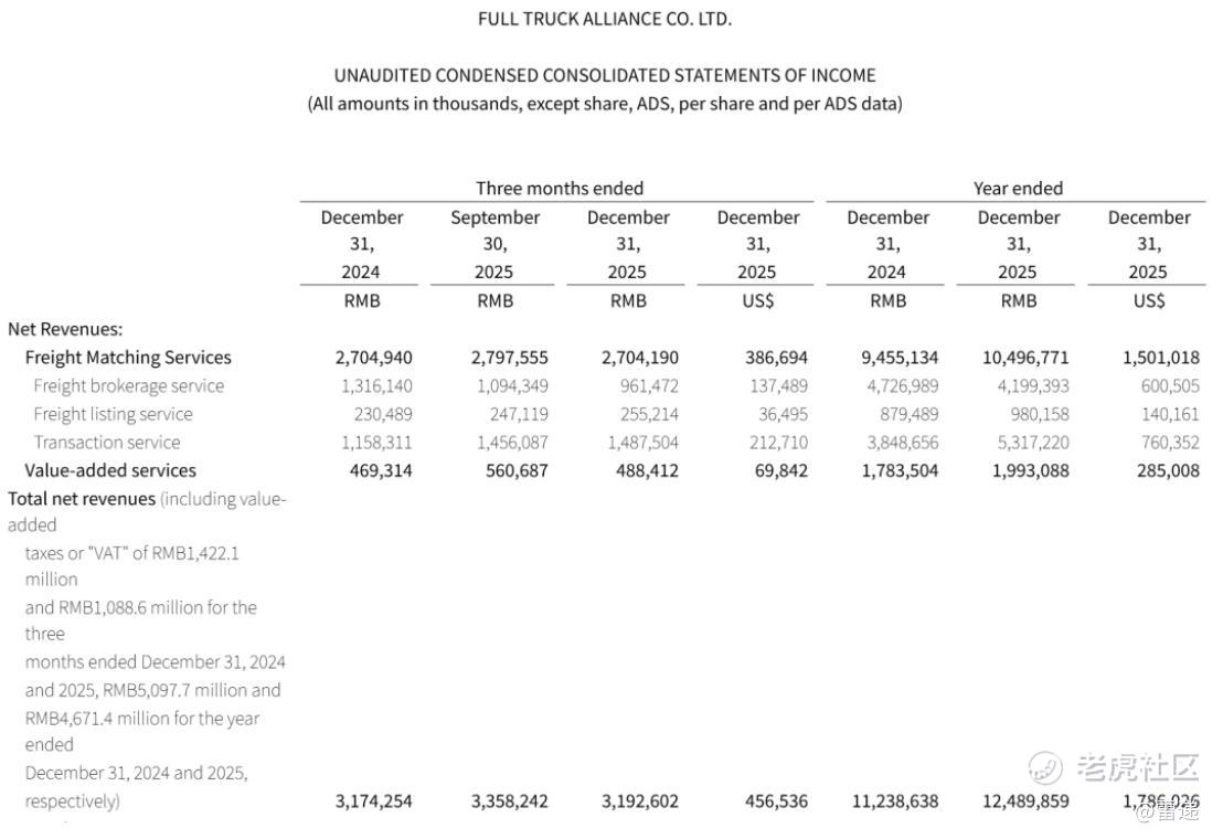 满帮集团2025年第四季度货运匹配服务(Freight matching services)收入为27.04亿元(约3.867亿美元),上年同期为27.05亿元。满帮集团称,轻微下降的主要原因是货运经纪服务收入减少,但交易服务收入和会员费收入的增加抵消了这一减少。