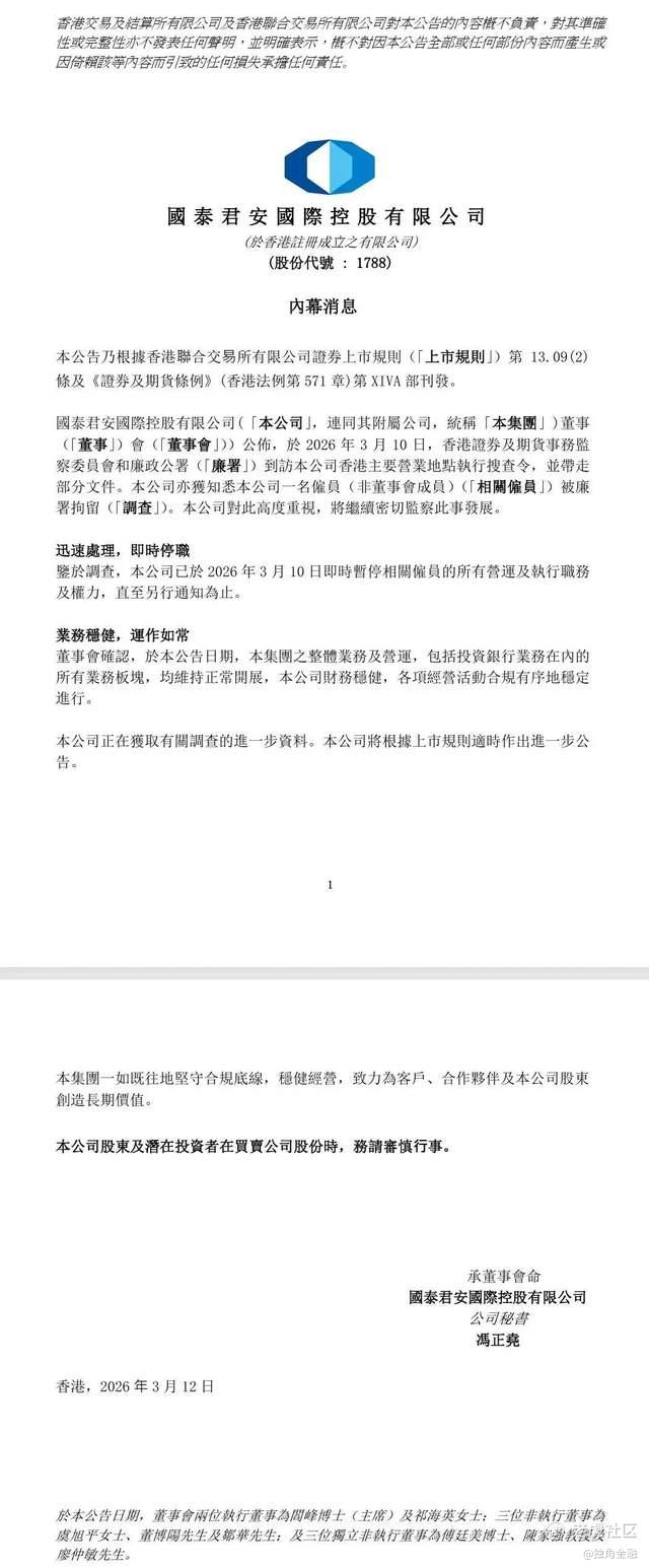 3月12日早上,国泰君安国际(1788.HK)公告,证实香港证监会和廉政公署到访公司香港主要营业地点执行搜查令,一名雇员被廉政公署拘留。公司已即时暂停相关雇员的所有运营、执行职务及权力。公司董事会确认,整体业务及营运,包括投资银行业务在内的所有业务板块,均维持正常开展,公司财务稳健,各项经营活动合规有序地稳定进行;另外一家券商中信证券目前暂未发布公告。