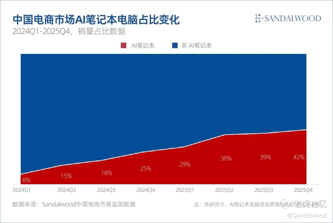 从市场规模来看,根据Sandalwood中国电商监测数据显示,2025 年中国笔记本电脑线上市场中,AI笔记本占比从2024年的8%显著提升至2025年的42%,此外,2025 年国内 AIPC 销量同比增长高达111%。
