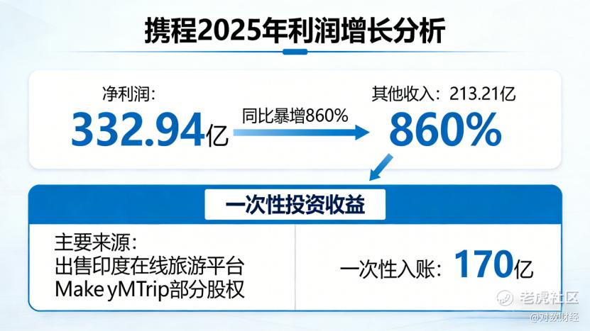 回到财报本身,334亿元的净利润中有213亿元属于“其他收入”,同比暴增860%,主要来源于一次性投资收益,包括出售印度在线旅游平台MakeMyTrip部分股权入账约170亿元。
