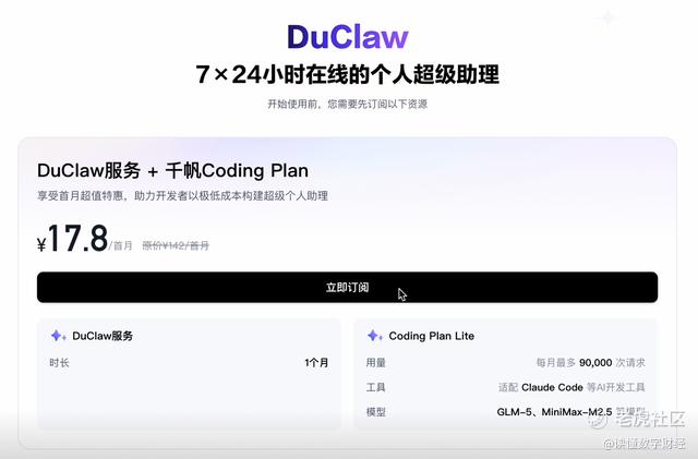 百度智能云同步开启了3月限时活动,首购用户仅需17.8元/月即可享受原价142元的超值服务。这意味着用户只需花一杯咖啡的钱,即可获得一套完整的AI超级个人助理服务,极大降低了个人开发者和AI爱好者的试用成本。此外,官方托管的零部署方式也有助于用户避免因自行安装配置不当带来的潜在使用风险。