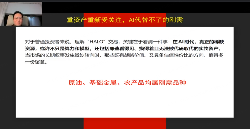 HALO交易概念:HALO易指重资产加低淘汰率,即刚需资源。在 AI 时代,投资目光转向底层基础资源,如原油、基础金属、农产品等。