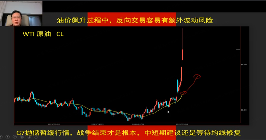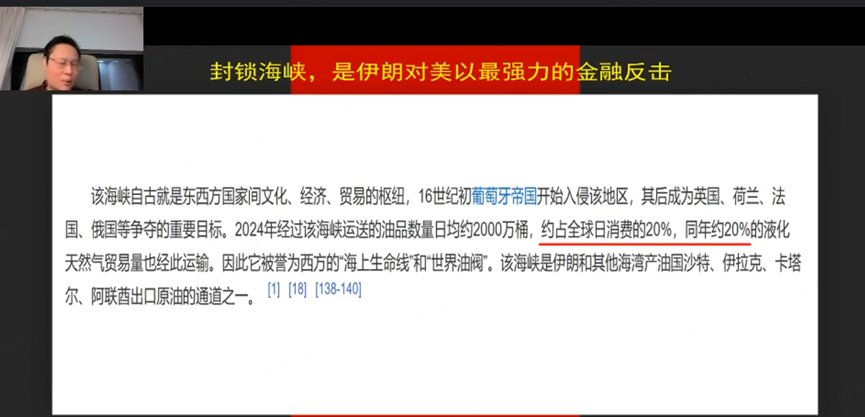 老师一上来先复盘了上周原油的剧烈波动,并说“对美国最有杀伤力的手段就是封锁霍尔木兹海峡,这一点我从去年到现在讲原油时一直强调。”