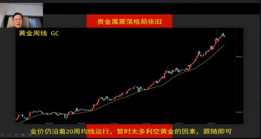 本章节讨论了贵金属情况,以美国在委内瑞拉和伊朗的行动为例,指出其行动多在周末且迅速达成目标,市场对军事行动敏感度降低,贵金属避险作用不明显,如黄金价格未达抗通胀或美元降息预期涨幅,只是在高位波动,目前沿20周均线运行,且无重大利空,跟随均线走势即可。