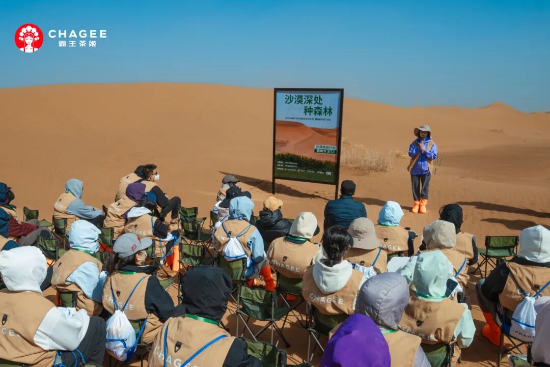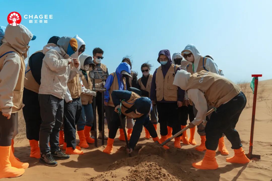 3月12日植树节期间,霸王茶姬(甘青宁)携手沙漠绿洲计划,开启一系列公益活动。30多位茶友与霸王茶姬一起,前往腾格里沙漠种下花棒林。在线上,霸王茶姬通过官方账号开启“云认养一颗花棒”活动,茶友在指定评论区留言即可参与。