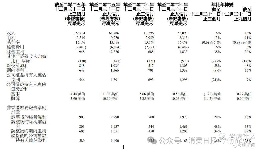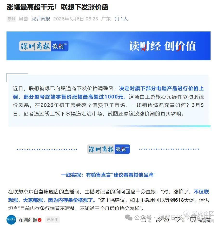 2026财年第三季度财报(2025年10月1日—2025年12月31日)显示,由于核心零部件涨价,联想当期营收虽然同比增长18%至222亿美元,但净利润却同比下滑超20%,即便拥有规模优势和成熟的成本控制措施,也未能抵消供应链的巨大冲击,只能将成本压力传导至终端售价。