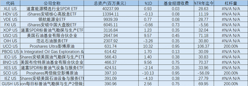 从年初至今的表现看,原油相关ETF整体涨幅明显。两倍做多原油期货的 $二倍做多彭博原油ETF(UCO)$ 年内上涨106.37%,在表中表现最强;跟踪WTI原油期货价格的 $美国原油ETF(USO)$ 年内上涨71.18%;两倍做多油气勘探生产指数的 $Direxion Daily S&P Oil &Gas Exp. & Prod. Bull 2X Shares(GUSH)$ 年内上涨69.95%;跟踪布伦特原油期货的 $美国布伦特原油基金有限合伙企业(BNO)$ 年内上涨70.37%。传统能源股票ETF中, $油气开采指数ETF-SPDR S&P(XOP)$ 年内上涨32.04%, $SPDR能源指数ETF(XLE)$ 年内上涨28.63%, $Vanguard Energy ETF(VDE)$ 年内上涨28.77%。
