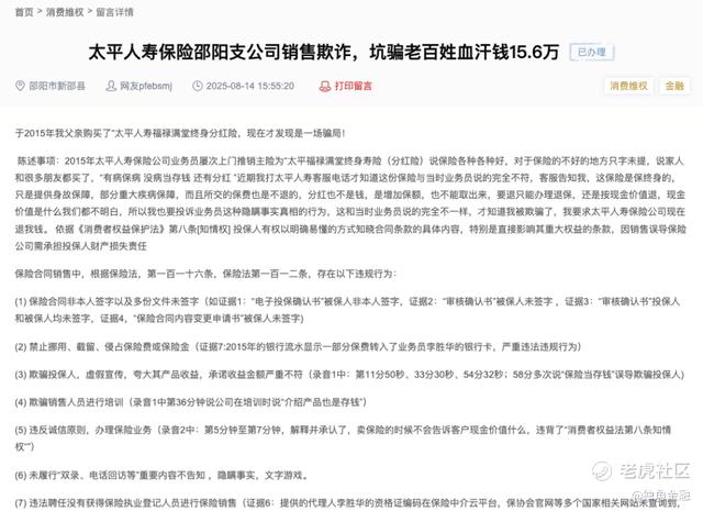 与此同时,而太平人寿早期推出的分红险产品,还在遭到投诉,投诉原因均为“销售误导”。如2025年8月14日,一位消费者在红网“百姓呼声”页面称,2015年太平人寿保险公司业务员屡次上门推销主险为“太平福禄满堂终身寿险(分红险)”,过程中存在销售误导;另一名消费者2025年8月在黑猫投诉平台上称太平保险在销售保险产品过程中存在严重的误导行为,涉及产品为“太平金无忧终身寿险(分红型)”。