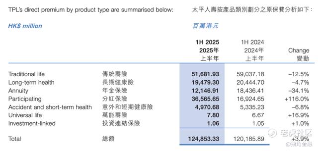 根据中国太平2025年中期业绩报告,太平人寿的产品结构已发生质的改变。按产品类别划分,传统寿险、长期健康险、年金保险的原保费收入均出现不同程度的下滑,分别同比下降12.5%、4.7%和34.1%。与之形成鲜明对比的是,分红保险原保费收入达到365.65亿港元,占比约30%,同比增长116%。