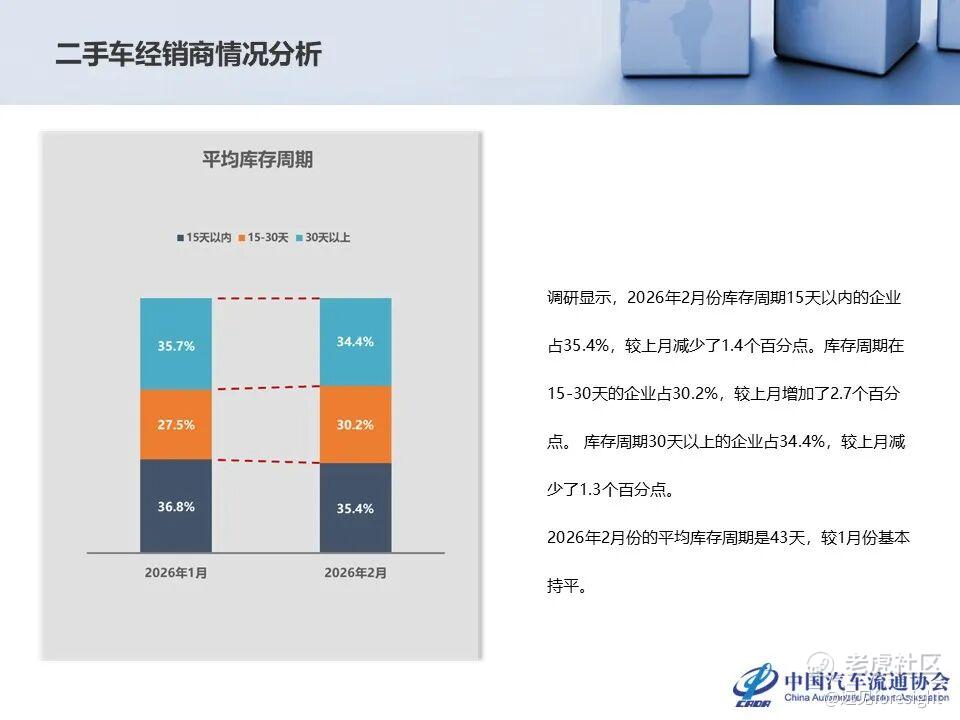 2月份车商的平均库存周期是43天,跟1月份基本持平。这个数字,在如今的行情下是非常危险的。