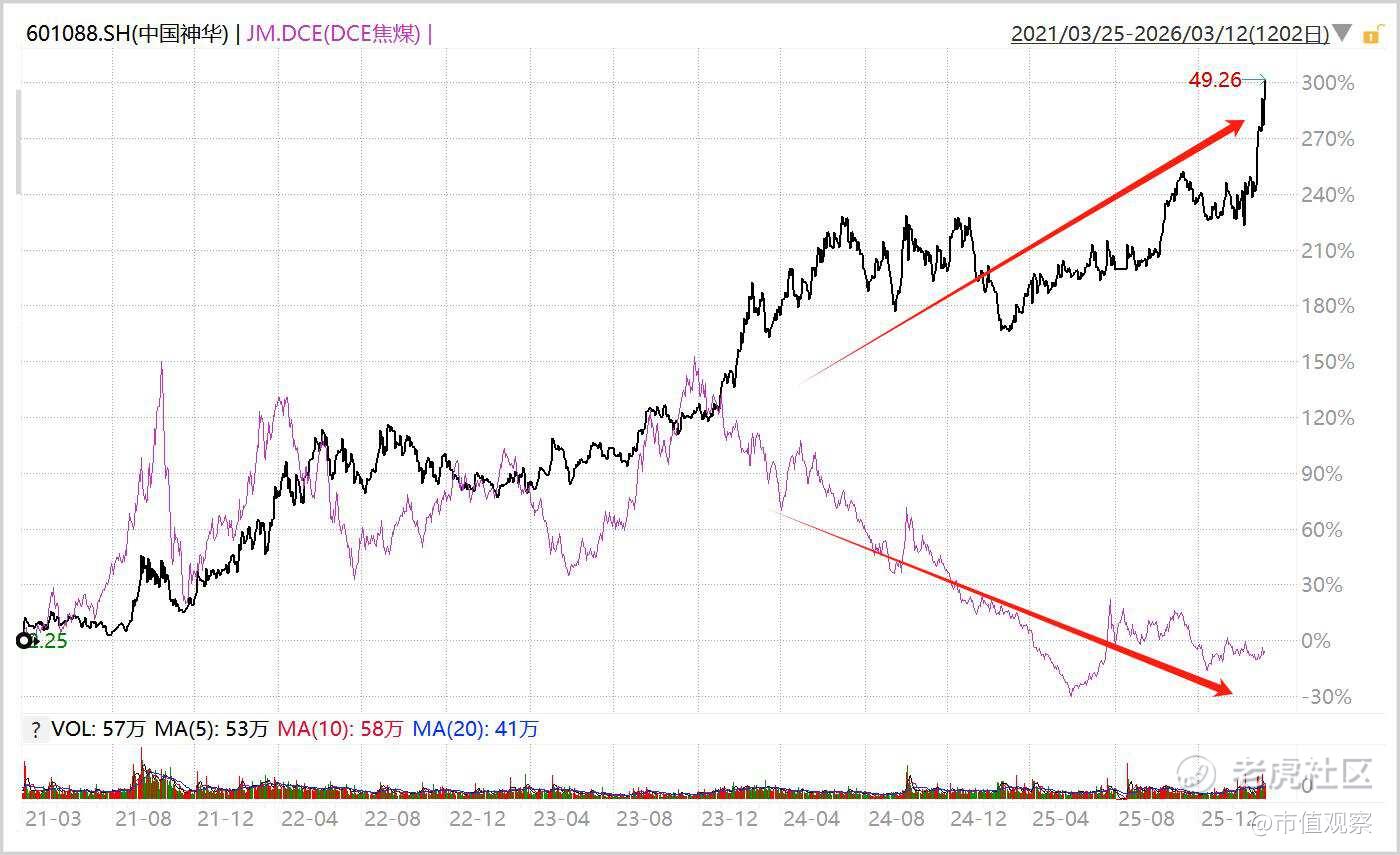 总体来看,煤炭板块这轮长达几年的趋势行情,深层次动力源于资本市场对行业底层逻辑出现了重估。供给侧改革优化了供给格局,“双碳”政策锁死了资本开支,利率下行又推升了现有价值。这轮浪潮中,当周期褪去、红利显现,那些真正拥有成本壁垒的龙头,成为了市场赢家。 $中国神华(601088)$ $陕西煤业(601225)$ $中煤能源(601898)$