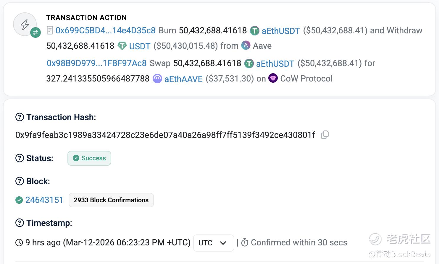 第一步,用户在 Aave V3 上持有的 aEthUSDT(生息 USDT 凭证)被赎回为 5043 万枚 USDT。这一步是协议内部的赎回操作,资金完整到账,没有任何损失。