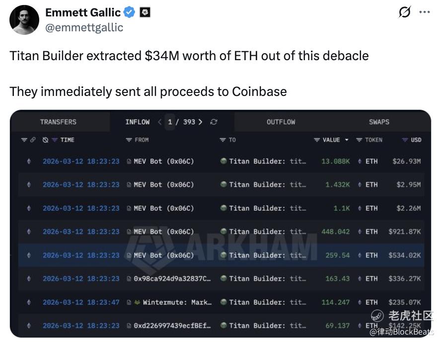 吃到最大一块肉的是以太坊区块构建者 Titan Builder,约 3400 万美元。链上分析师 @emmettgallic 追踪发现,Titan 从这笔交易所在的区块中提取了这笔巨额 ETH,并在区块确认后立即将全部所得转入 Coinbase。