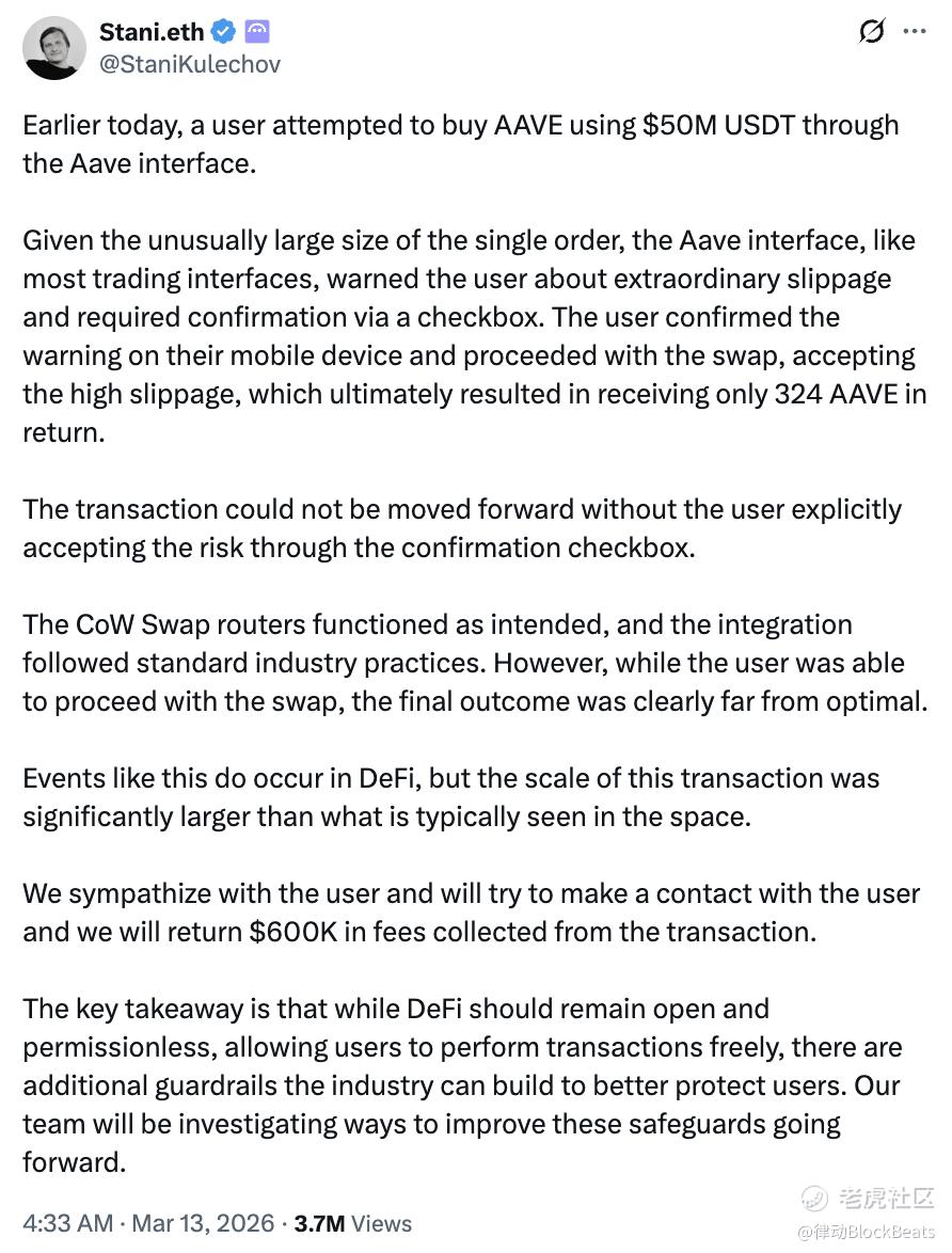 Aave 创始人 Stani Kulechov 随后发推表示同情,承诺退还交易中收取的约 60 万美元前端费用,并称将「研究如何改善这些保护措施」。但 5000 万美元的损失已成定局,链上不可逆转。