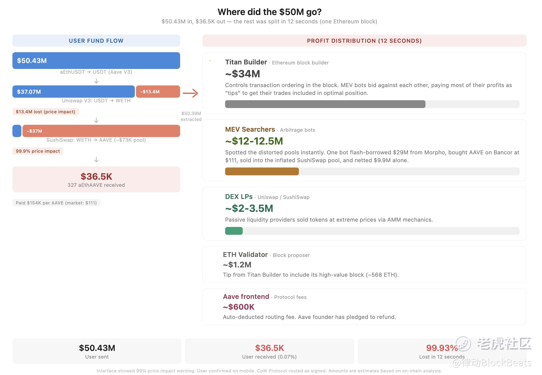 最后一层是 Aave 前端本身,约 60 万美元。无论交易结果多么惨烈,Aave 前端的路由集成会自动按比例收取前端费用。Stani Kulechov 已公开承诺尝试退还这笔钱。