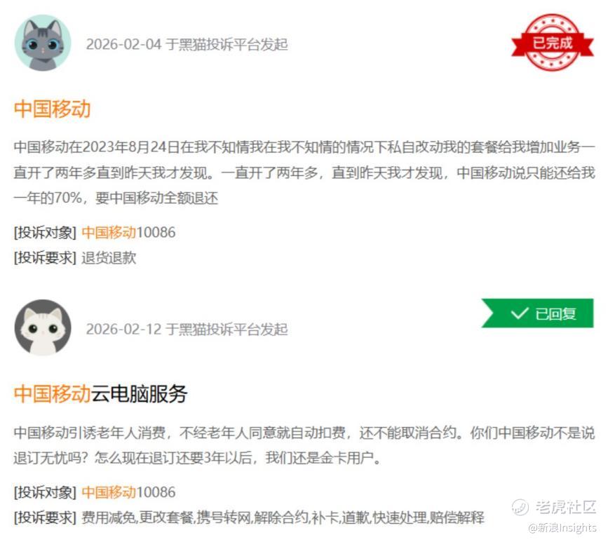 小胡的遭遇并非孤例。在黑猫投诉上,与中国移动相关的投诉超过了42万条,远高于中国联通和中国电信。有消费者表示,“中国移动在我不知情的情况下私自改动我的套餐给我增加业务。”还有用户投诉称,“中国移动引诱老年人消费,不经老年人同意就自动扣费,还不能取消合约。”