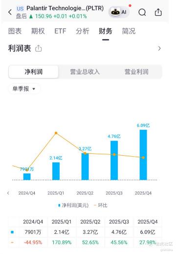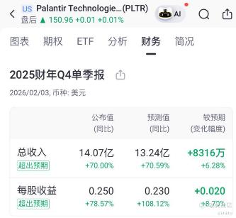 于是,Palantir在2025年实现了从"高增长亏损"到"高增长高盈利"的关键跨越,财务指标呈现出罕见的优质SaaS特征。2025年全年收入44.8亿美元,同比增长56%。2025年Q4收入14.1亿美元,同比增长70%,超出华尔街预期近1亿美元。2026年指引里,管理层预计收入71.8-71.98亿美元,同比增长约61%,显示增长仍在加速。