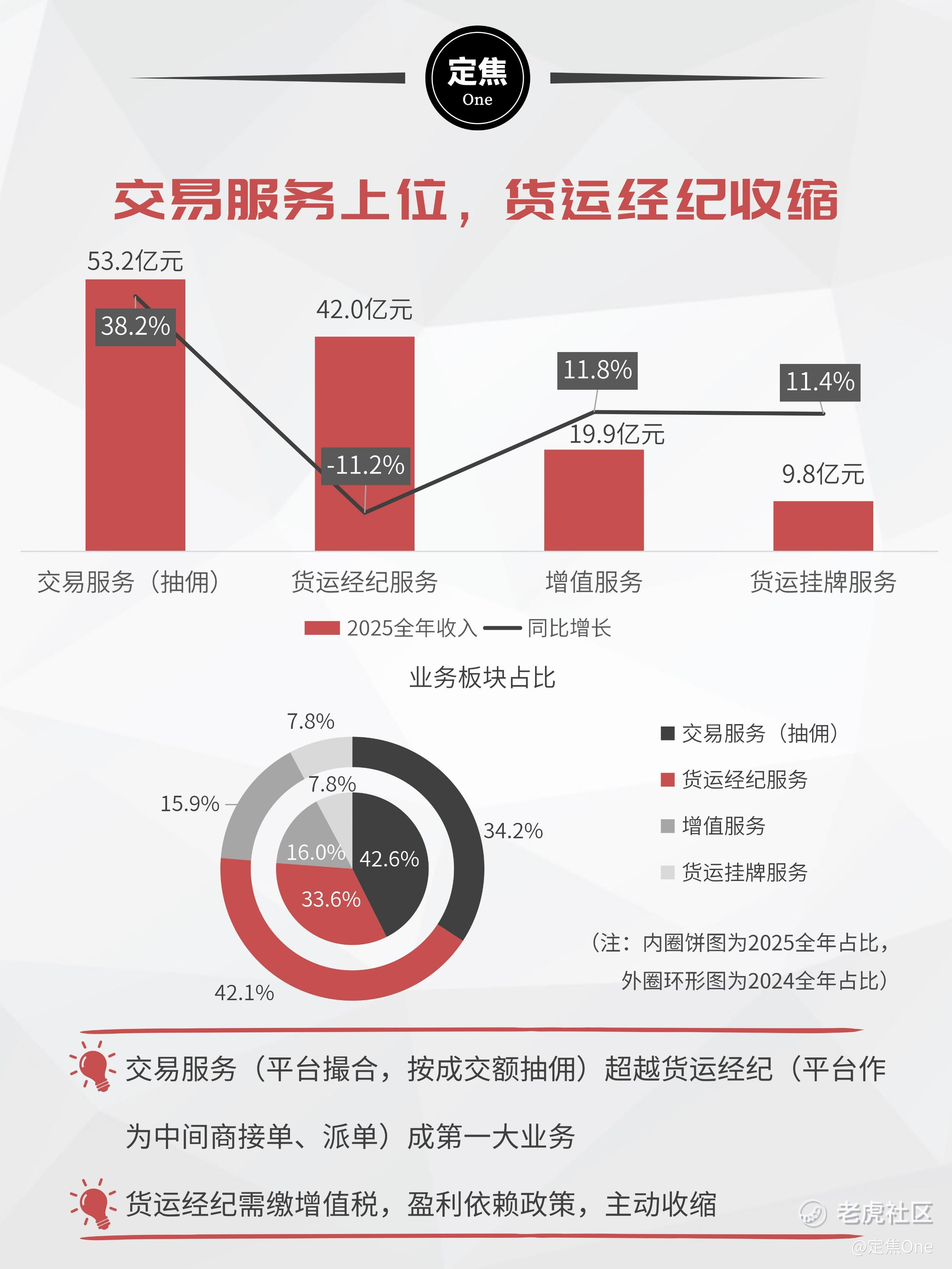 与此同时,交易服务填上了这个缺口。Q4交易服务收入同比增长28.4%,全年增速高达38.2%,首次超越货运经纪,成为公司第一大收入来源。Q4的佣金渗透率达到88.6%,每单平均货币化金额26.3元,覆盖城市扩展至273城。