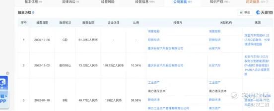 根据天眼查App显示,深蓝已经完成了4轮融资,最近的一轮,于去年年底完成了总额为61.22亿元的C轮融资,投资方包括长安汽车、重庆渝富控股集团及招银金融资产投资有限公司。