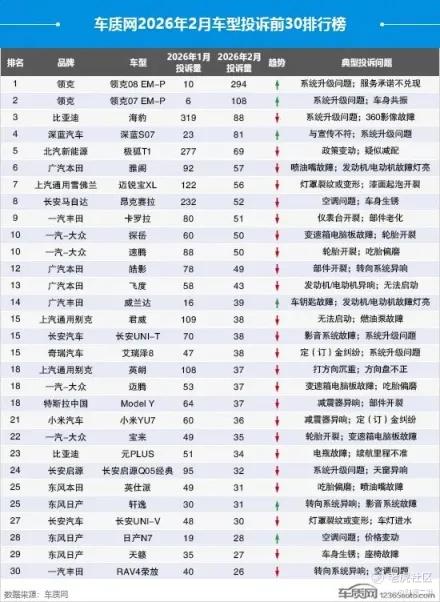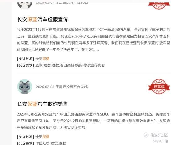 根据第三方车质网发布的2月汽车投诉榜单显示,长安深蓝S07以环比激增超2.5倍的投诉量跃居SUV投诉榜第四位,成为当月投诉量增长最快的车型之一。