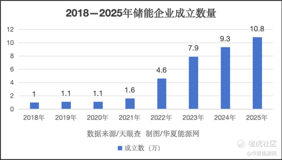 天眼查显示,目前,国内已成立的储能企业数量在43.6万家以上,其中仅2025年一年便有10.8万家新成立的企业,2024年是9.3万家,2023年是7.9万家,2022年是4.6万家,更早的2021年,是1.6万家,而2019年之前,每年成立的储能数量只有几千家。