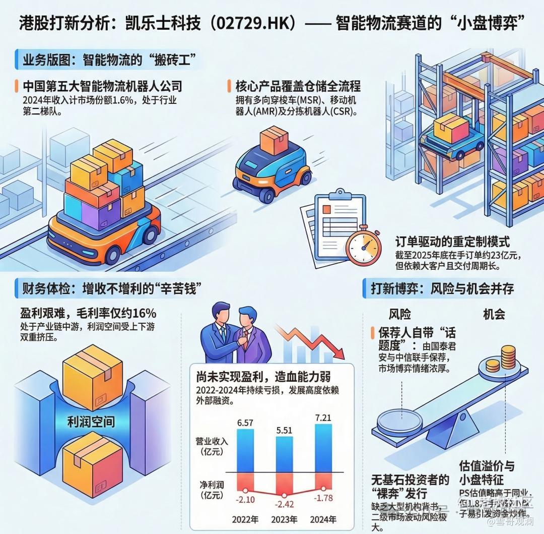 一句话总结业务:凯乐士卡在了仓储物流自动化的大趋势上。生意是项目制、to B、重定制,依赖大客户订单。有技术,但赛道里巨头环伺(想想那些物流巨头自家的机器人公司),活得并不轻松。