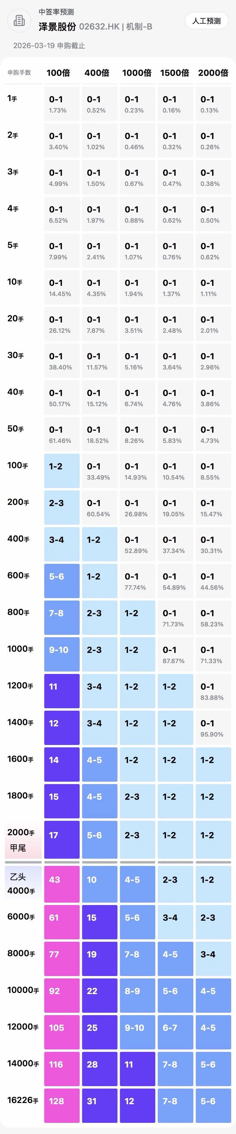 如果最终孖展500倍左右,那么甲尾预估5手左右,乙头8手左右。