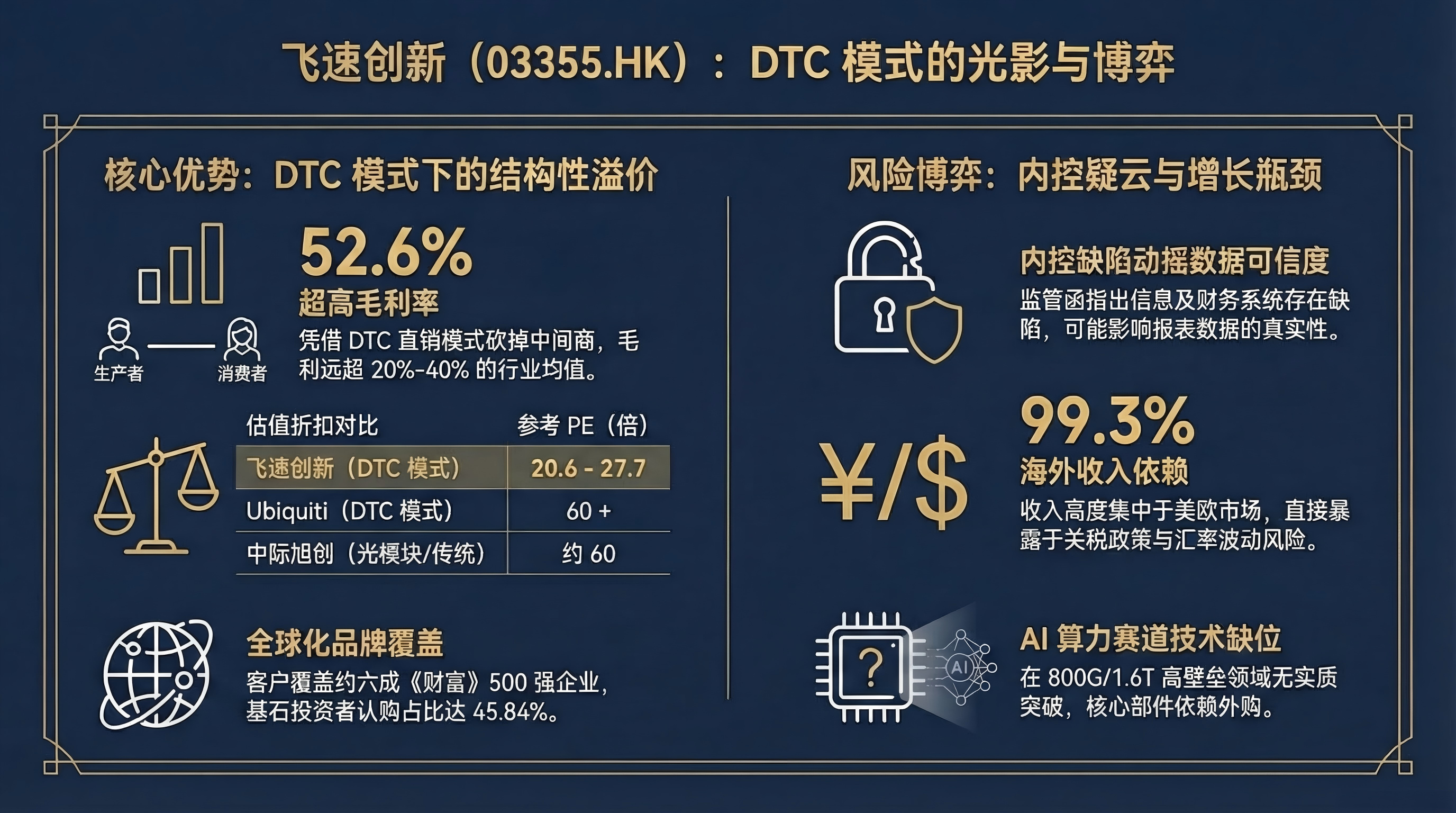 先说吸引人的地方。公司是全球第二大线上DTC网络解决方案提供商,市占率6.9%,100G及以上高端领域全球第一,通过FS.com直接面向全球超50万客户销售,覆盖《财富》500强中约六成企业。DTC直销模式最大的价值在于毛利——砍掉经销商之后,2025年前三季度毛利率达52.6%,远超行业20%至40%的均值,这不是偶然,是模式决定的结构性优势。发行PE仅20.6至27.7倍,而同样采用DTC模式的美股Ubiquiti维持60倍以上,中际旭创、光迅科技也接近60倍,飞速创新的估值折扣是真实存在的。