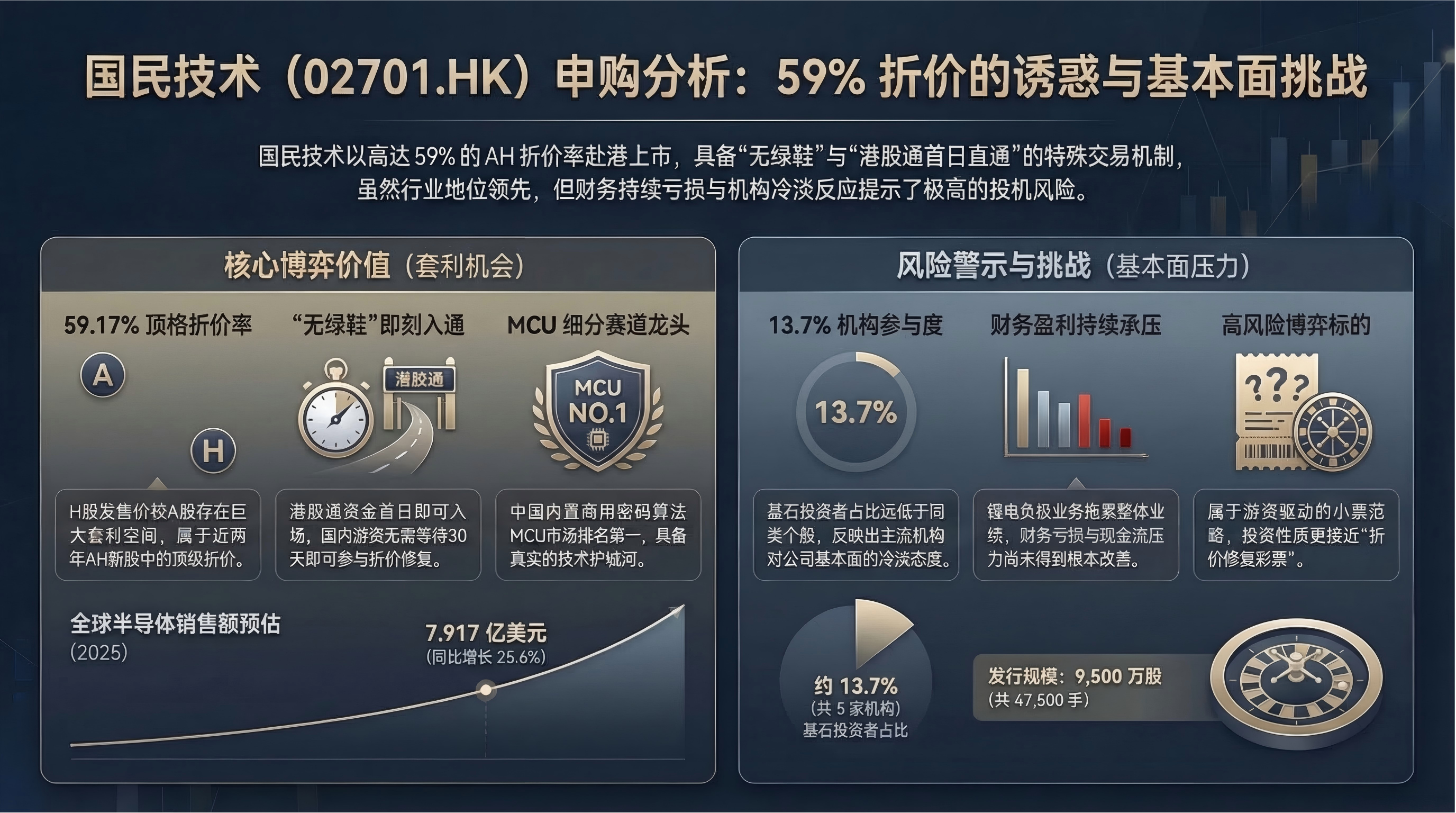 $国民技术(02701)$ 是这三只票里最"折价当道"的一个,按H股发售价10.80港元对应A股约9.48元人民币计算,港股较A股折价约59.17%,放眼近两年AH股新股中,这个折价率妥妥地属于顶格水平。再加上全球发售9500万股,共47500手,货量充足,无绿鞋,港股通首日即可入场,流动性条件也不差。