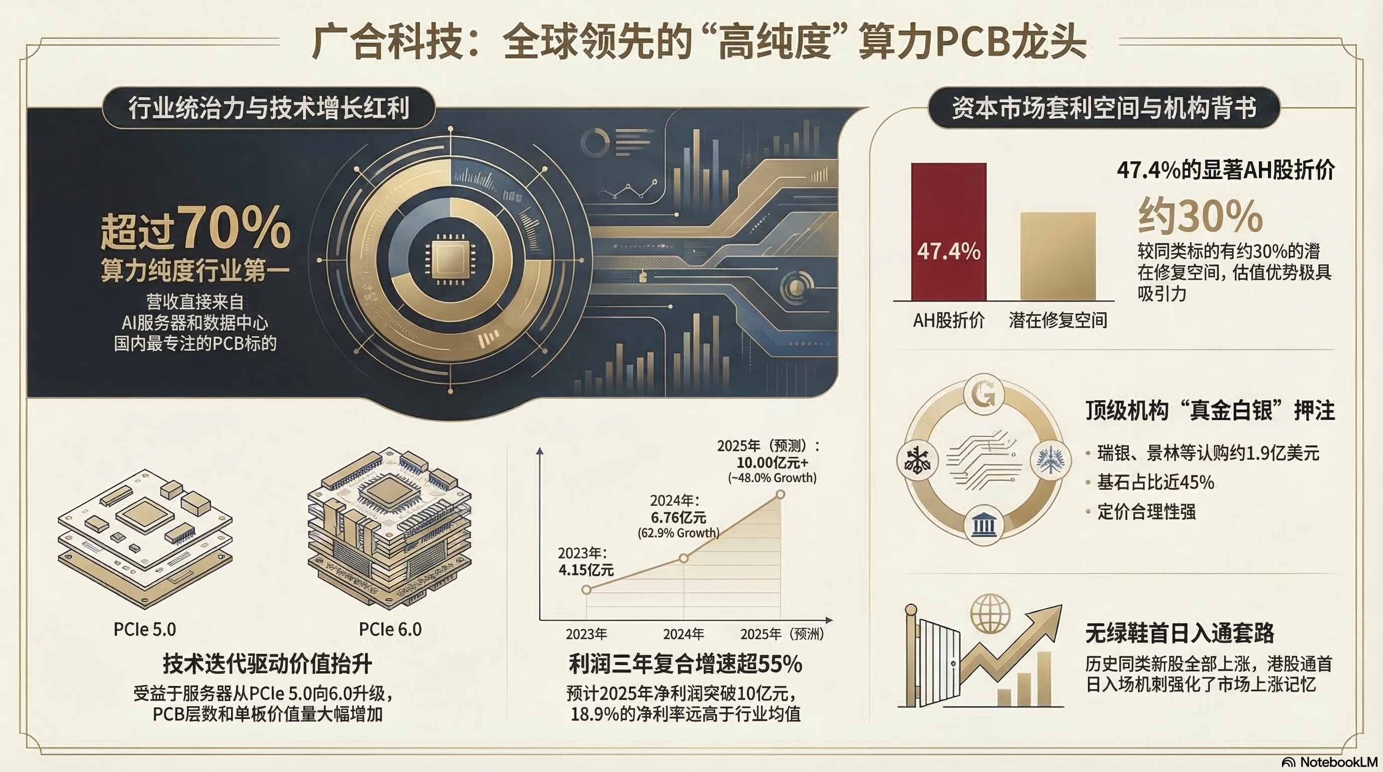 先说赛道。广合科技是国内算力服务器PCB的绝对龙头——按2022至2024年累计收入计算,全球算力服务器PCB制造商排名第三、中国大陆排名第一,CPU主板PCB全球份额12.4%。跟沪电股份、胜宏科技这些老牌大厂比,广合科技赢在"专注":超过70%的营收直接来自AI服务器和数据中心交换机,没有消费电子、汽车电子这些杂项分散注意力,是真正意义上的"算力纯度最高"的PCB标的。你每买一张英伟达GPU服务器,背后的PCB很可能就从广合科技出来。