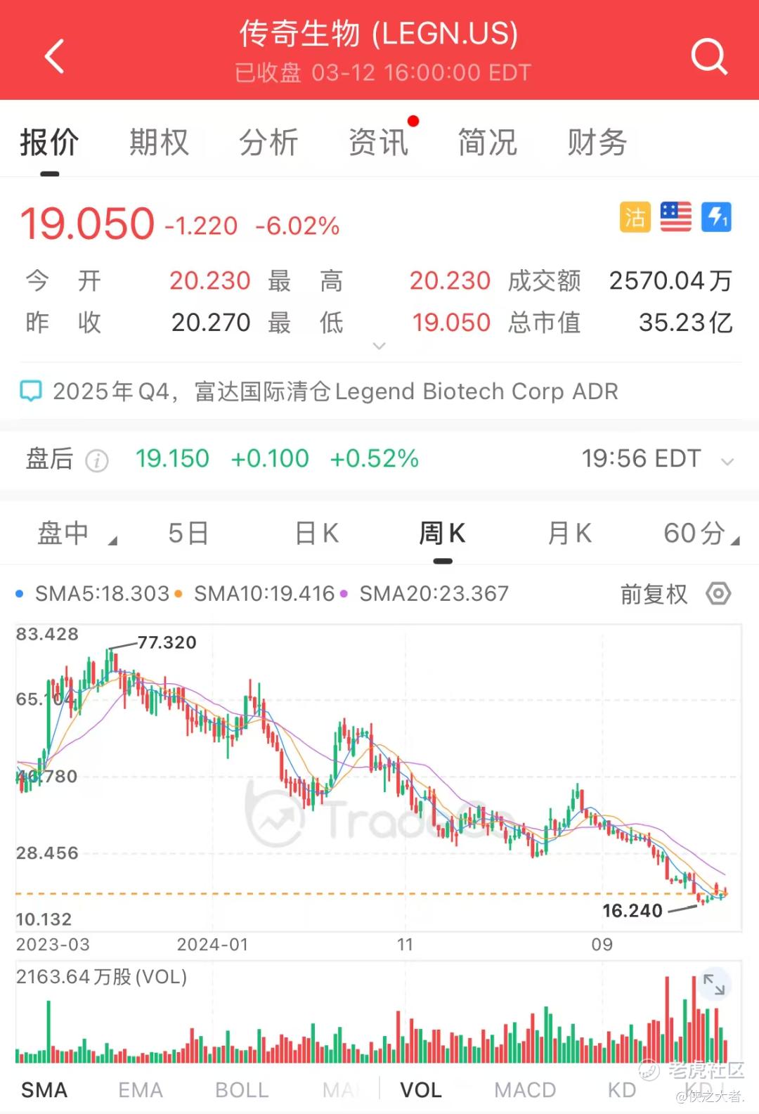 传奇生物股价自2023年7月份以来已累跌超75%。