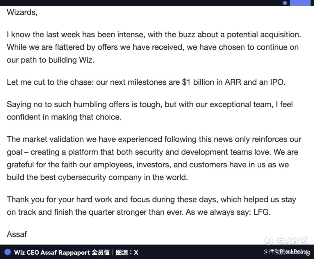 「我知道过去一周非常紧张,围绕潜在收购的传闻不断,虽然我们对收到的邀请感到受宠若惊,但我们选择继续打造 Wiz 的道路。」Wiz CEO Assaf Rappaport 在发给全员员工的邮件中说 Wiz 的下一个里程碑是 10 亿美元的年化收入和 IPO。