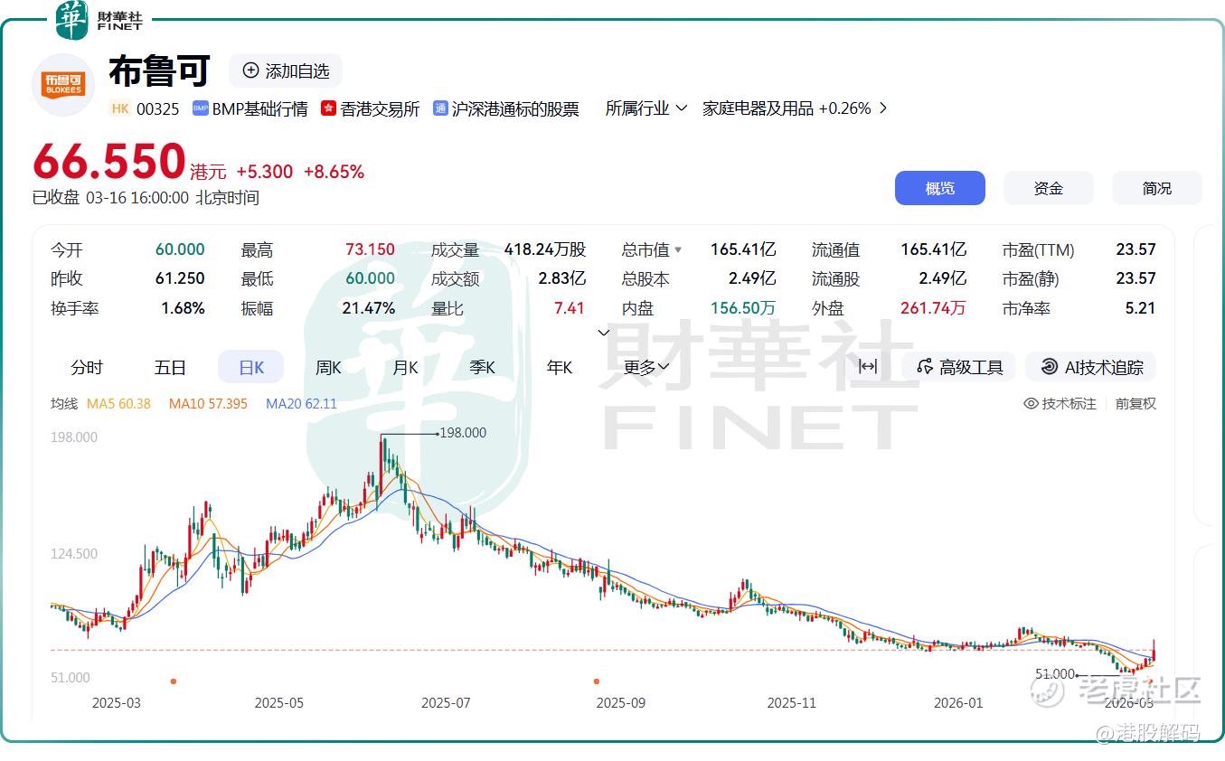 业绩发布后,3月16日,布鲁可股价大幅拉升,截至收盘,涨幅为8.65%,报66.55港元/股。