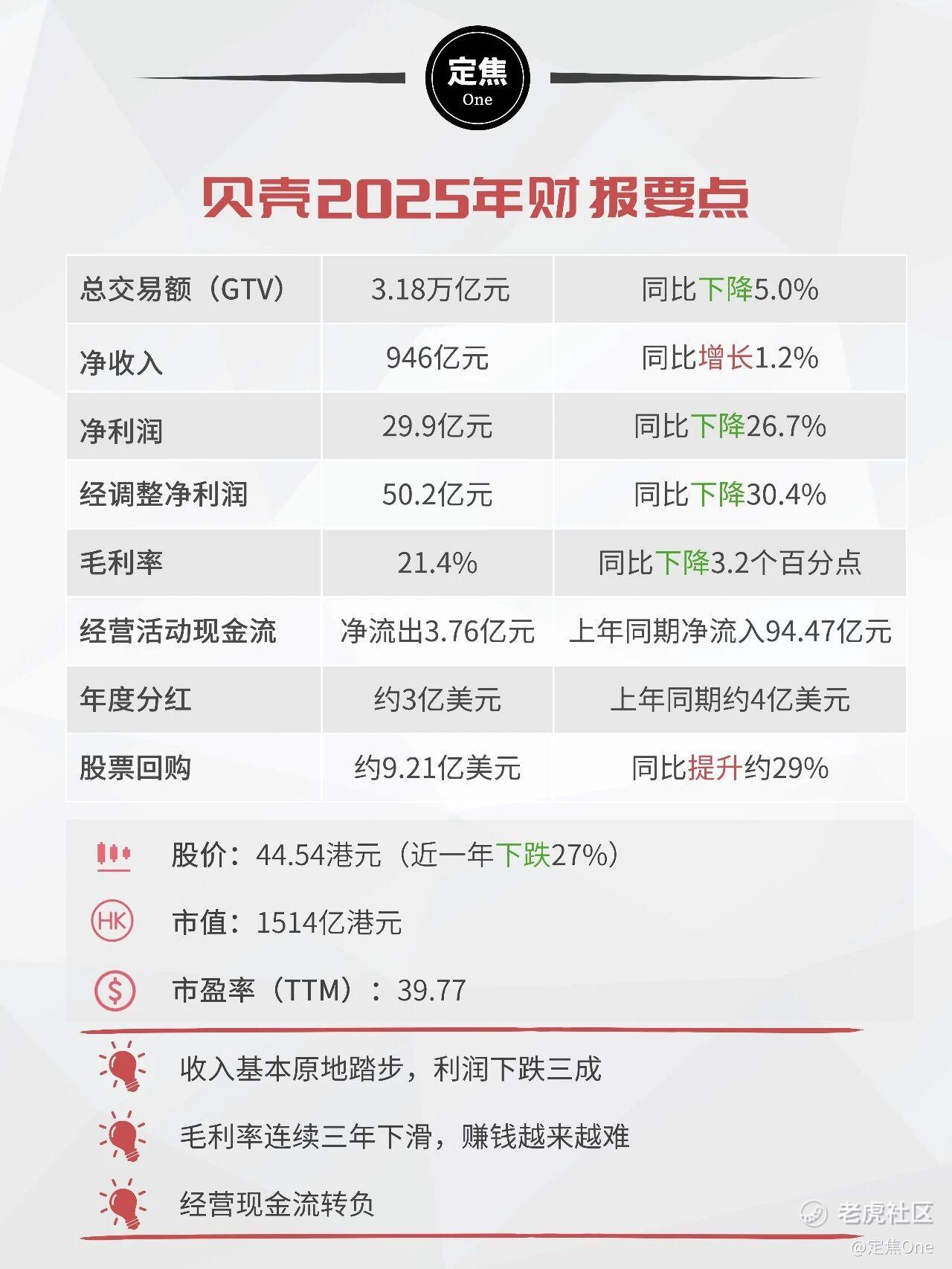 单看Q4,贝壳净收入同比下降28.7%,经营利润更是从盈利10.1亿元,转为亏损1.47亿元;经调整净利润同比大跌61.5%。
