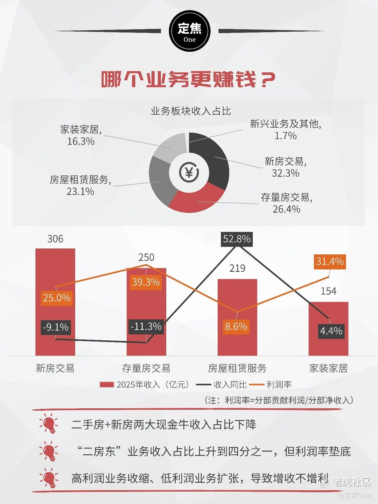 过去,贝壳主要靠存量房和新房交易这两大“现金牛”赚钱——存量房贡献利润率高达39.3%,新房也有25%。但在2025年,这两大基本盘双双下滑:存量房收入下降11.3%,新房收入下降9.1%,合计占总收入的比重从2024年的66.4%降至58.7%。