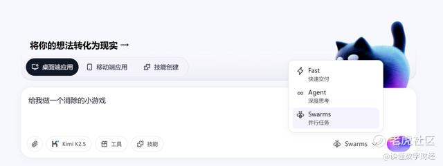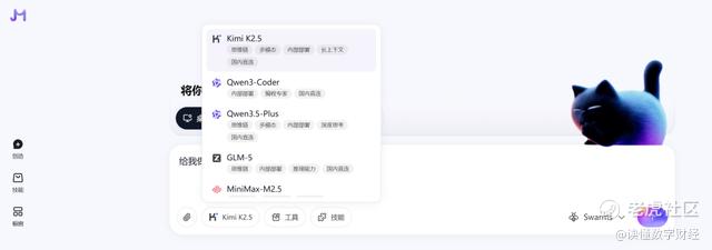 同时,“创造”模块聚合了多个支持国内直连与内部部署的主流大语言模型,包括:Kimi K2.5、Qwen3-Coder、Qwen3.5-Plus、GLM-5、MiniMax-M2.5,各个大模型均支持Fast(快速交付)、Agent(深度思考)、Swarms(并行任务)。