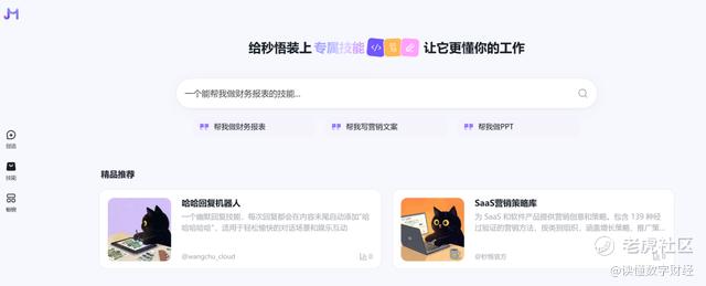 “技能”对话框下方展示了三个技能“帮我做财务报表”、“帮我写营销文案”和“帮我做PPT”,而其技能不仅仅局限于这三者。在官方定义中:“秒悟Meoo技能市场是秒悟平台面向开发者与普通用户提供的技能集合页面。技能市场中汇集各类开箱即用的AI技能,涵盖开发、测试、回复、文档、数据、设计、效率、运维等多种类型。用户可直接浏览、查看、一键使用技能,也可上传、下载技能,快速满足日常开发、办公自动化、业务场景落地等需求。”