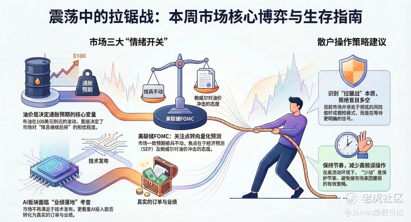 如果非要说我现在怎么想,我更倾向把当下理解成一场拉锯战:不是立刻V回来,也不是马上进入最坏情景,而是市场会在油价、联储态度和AI情绪之间来回摇。只要油价还在100美元附近晃,FOMC又没给出特别鸽的信号,那指数层面我觉得都很难特别舒服。所以这周我自己的思路还是偏保守一点,先看清楚,再决定要不要动。