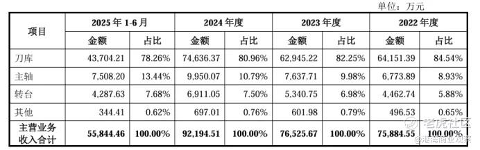 公司报告期内主营业务收入来自刀库产品,收入占比在80%左右。报告期内,冈田智能主营业务收入分别为7.59亿元、7.65亿元、9.22亿元、5.58亿元。其中,刀库的收入分别为6.42亿元、6.29亿元、7.46亿元、4.37亿元,占主营业务收入的比例分别为84.54%、82.25%、80.96%、78.26%。