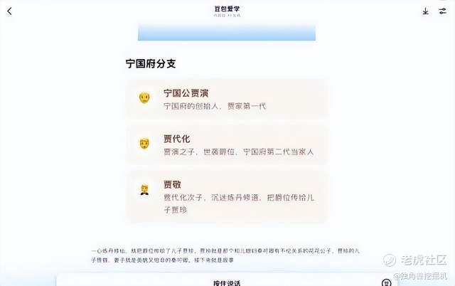 当孩子把《红楼梦》人物关系这个问题抛给豆包爱学,豆包一边开始娓娓道来,用语音讲解里面的人物关系,一边在屏幕上开始展示全人物关系结构图、各府分支等。