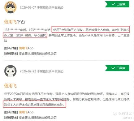 黑猫投诉平台上关于信用飞“爆通讯录”、“威胁恐吓”的投诉比利率相关的投诉还要多。有消费者反映,该借贷平台为了催收还款,委托第三方催收机构恶意泄露个人信息,将电话打到借款人工作单位,甚至言语带有威胁恐吓,严重影响借款人的正常工作和生活。
