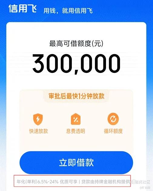 在贷前环节,信用飞的利率是消费者最常诟病的一点。尽管平台首页宣传的年利率(单利)为6.5%-24%,但用户在实际借款时,综合年化利率往往超出预期,甚至超过监管红线。