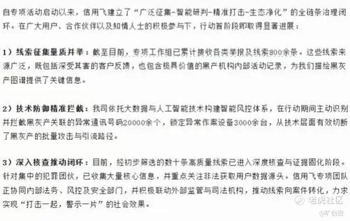 去年11月,信用飞启动了一项打击金融黑灰产专项治理行动,该专项行动专门针对征信修复、债务优化、反催收等领域的黑灰产乱象。