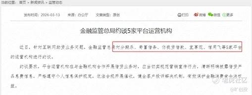 3月13日,国家金融监督管理总局发布了一则监管公告,针对互联网助贷业务问题,对分期乐、奇富借条、你我贷借款、宜享花、信用飞等5家平台的运营机构进行约谈。