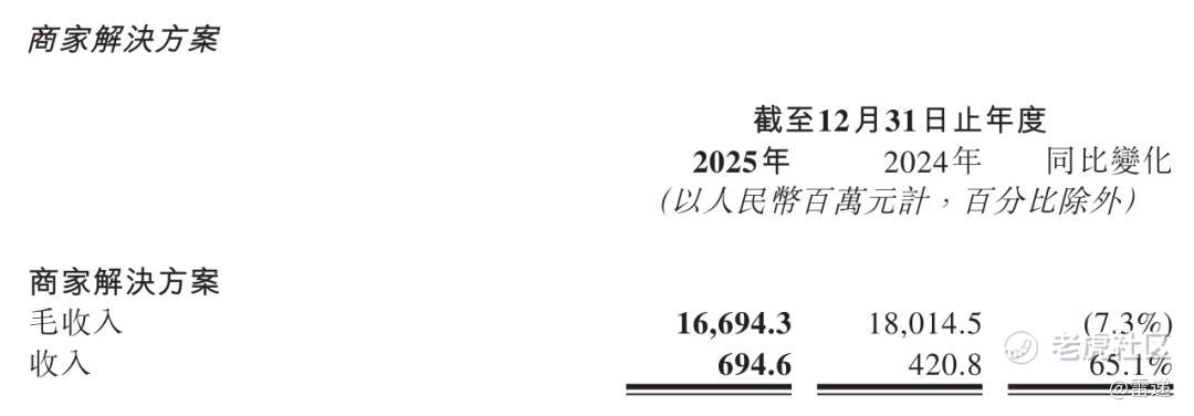 微盟2025年商家解决方案收入为6.95亿元,较上年同期的4.21亿元增长65.1%,主要原因是,将若干广告平台的2023年返点作出的一次性价格优惠已于2024年入账,导致2024年返点收入减少约1.29亿元;自广告平台取得的返点净额增加约2.27亿元,主要由于返点净额利率提升;及被缩减两条业务线导致TSO服务及信贷技术服务的收入减少8230万元所抵销。